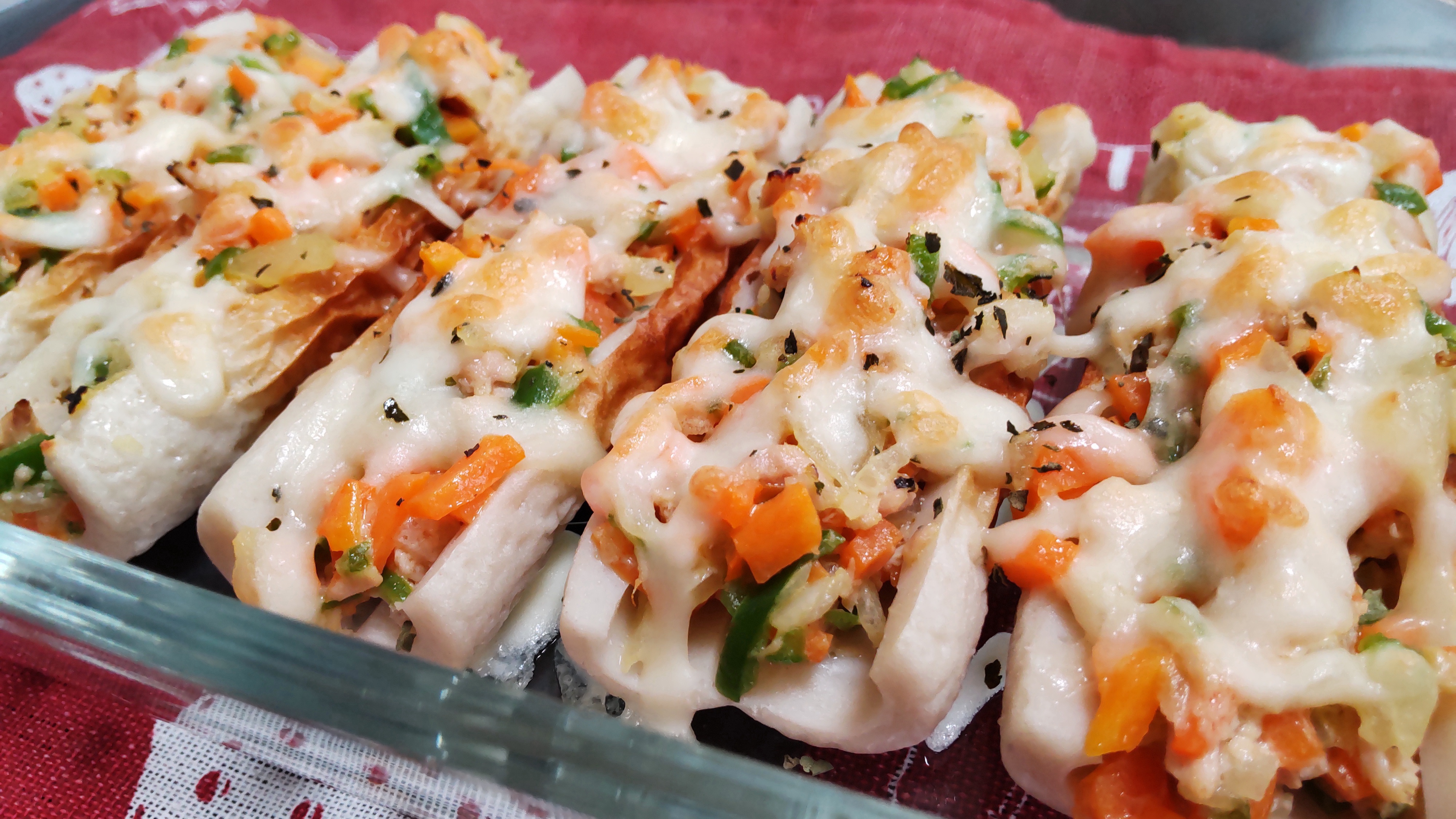 ③ 開いたちくわに②、チーズをのせ、オーブントースター(860W)で5分~10分焼く。